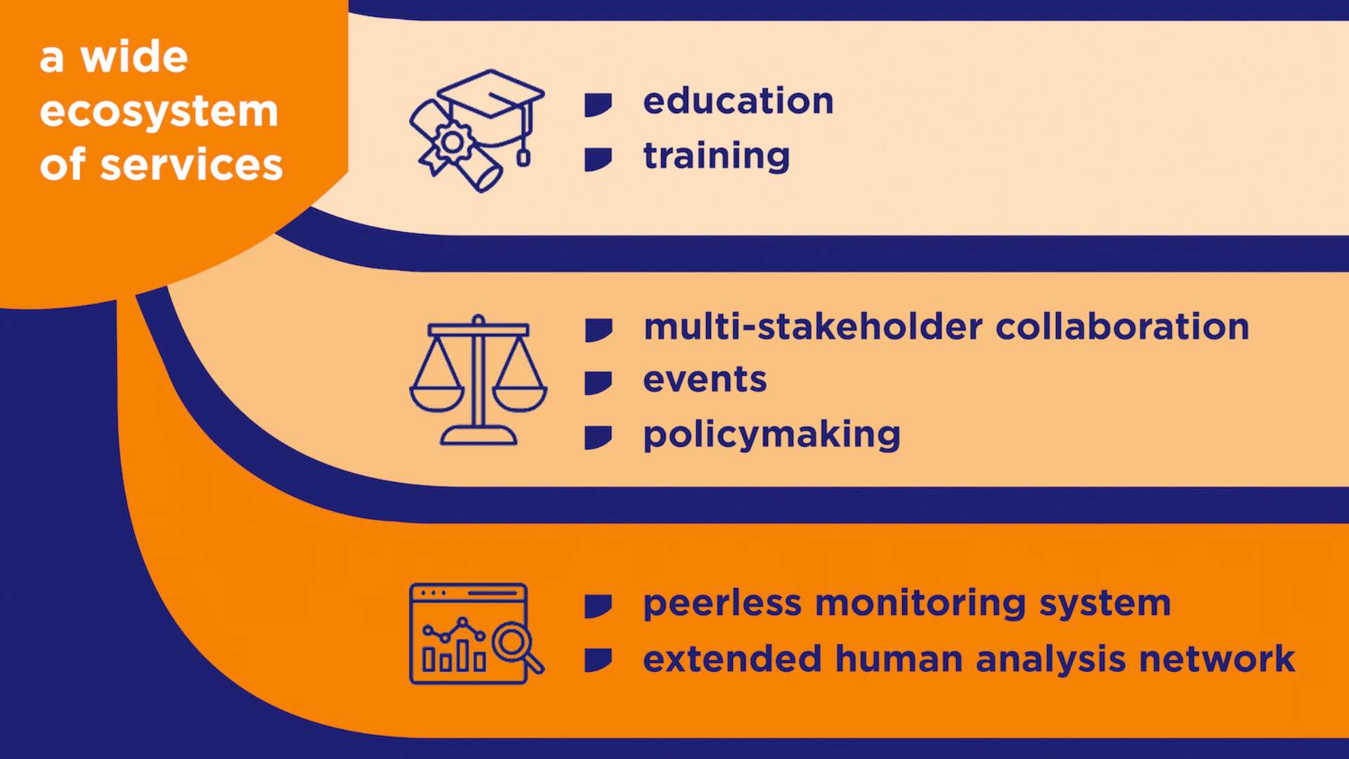 Services are expanding from monitoring and detection alone to a complete portfolio including education, training, multi-stakeholder collaboration, events, policymaking, extended human analysis networks and a peerless monitoring systems.