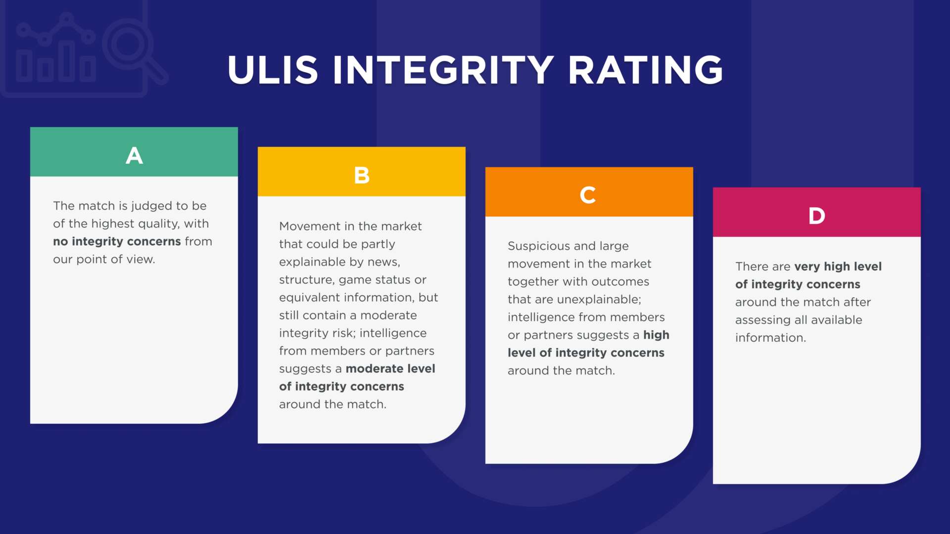 The integrity report includes detailed sections analyzing key components to be used to assess the match or the sport event. The data comes from information obtained from ULIS members and partners, odds analysis including pre-match and in-play, gameplay analysis, match scenario, etc. This gives an extra piece of evidence for relevant stakeholders to understand the potential risk and integrity concern of a sport event.