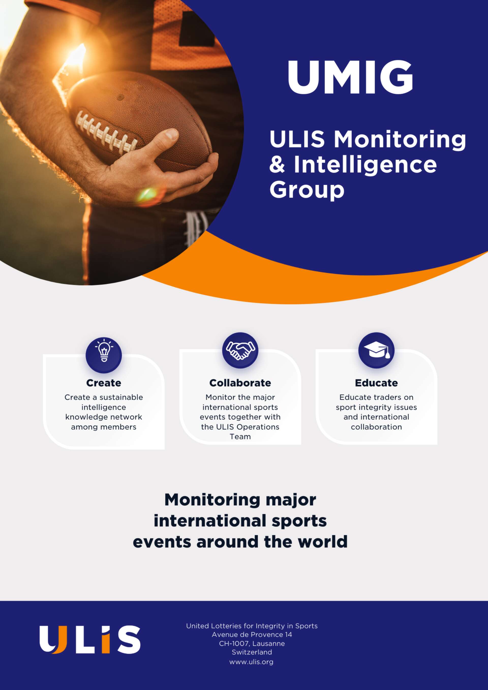 The ULIS Intelligence and Monitoring Group (UMIG) can be understood as a fixed international lottery task force composed of ULIS members in coordination with a team of expert analysts. UMIG is a dedicated collaborative group that monitors and shares valuable information throughout the sports event.